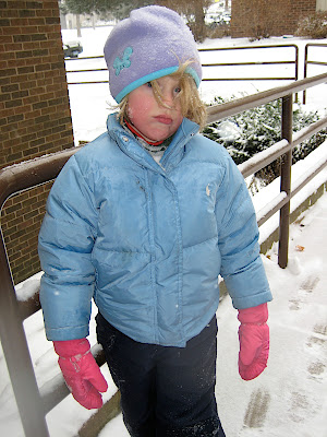 It's still snowing - we've got lots of inches. Grace has been out to play in the snow twice - this picture was taken after an hour of cold (wind-chill of negative seven degrees.) Note the rosy cheeks, forlorn expression, and the look in the eyes saying, "Daddy, hurry up and take the *&** picture because I'm cold."