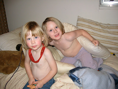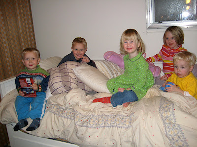 A collection of tow heads: Here are all the seminary kids piled in the guest room watching Mickey Mouse on DVD, while the adults talk, eat, and taste wine - Johannes, Andreas, Tovah, Grace & Toby.
