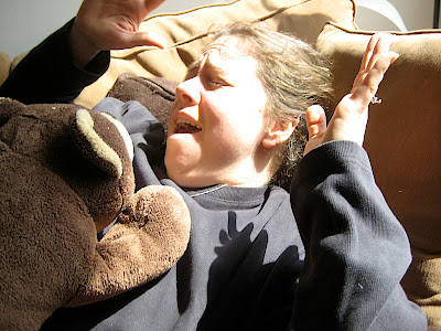 holding Curious George. Then he stands and dances in front of the TV