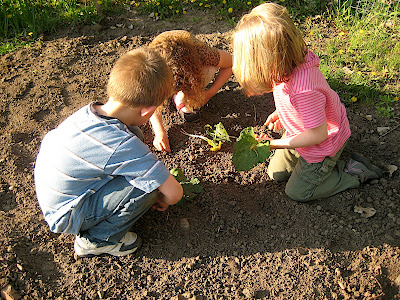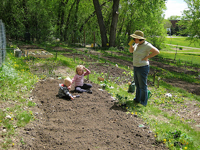 We have a nice little plot in the community pea patch. We planted a great variety of seeds and a few starts, and a week later we are seeing our garden sprout. In addition to providing us with something fun to do (watering the garden and playing with dirt and sticks and worms), the pea patch is a sort of community gathering place - there's usually a few other people tending their gardens when we're there. So the children always want to come when we go to the garden.