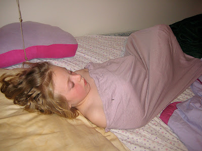 Here's Grace from two nights ago, quite mysteriously falling asleep inside a pillow cover:
